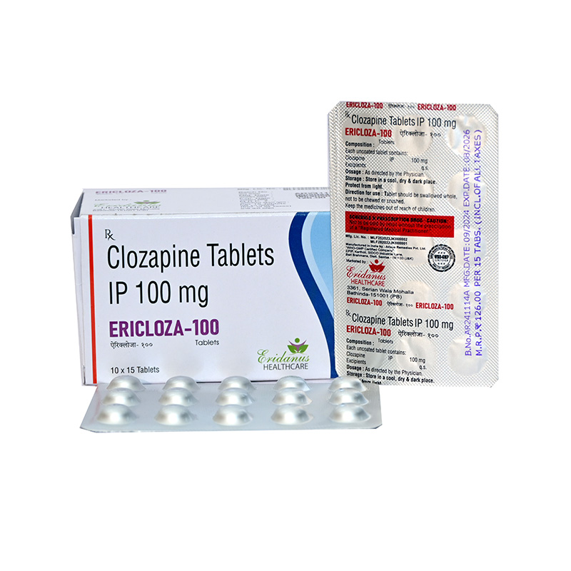 CLOZAPINE 100MG | ERICLOZA 100 – CLOZAPINE drug is widely used for treating mental/mood disorders such as schizoaffective disorders or schizophrenia. It is an antipsychotic medicine, that works by restoring the left natural substances such as neurotransmitters in the brain. The drugs help decrease hallucinations and prevent people from committing suicide and trying to harm their bodies. It directly works on your mental condition and helps you to think clearly and positively. Additionally, this medication has been shown to reduce the risk of suicidal behaviour in patients with schizophrenia. By taking Clozapine 100mg tablets as prescribed, individuals can experience improved mental health and overall well-being. Follow the precautions with the use of Clozapine Tablets for the best results. Take the medicine one time. Try to avoid using any medicine that causes health issues. The common symptoms with the use of Clozapine Tablets are mentioned below. One may suffer from nausea, vomiting, drowsiness, digestive issues, etc.