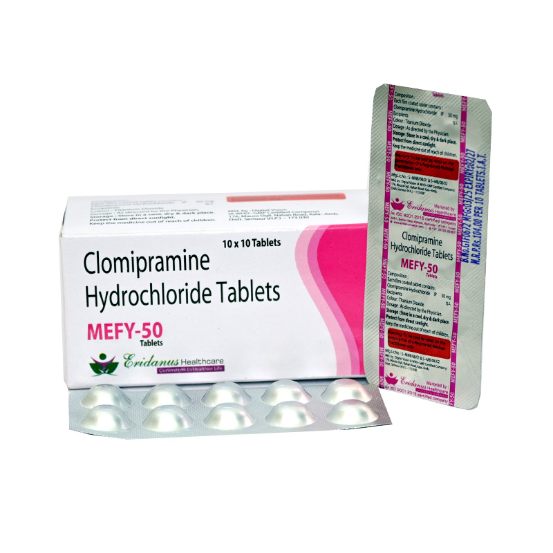 BRAND NAME: MEFY-50 COMPOSITION: CLOMIPRAMINE 50 MG TABLETS PACKING: 10x10 Clomipramine 50 mg Tablets are used in the treatment of Obsessive Compulsive Disorder; a disease in which an individual gets unwanted fears and anxieties that resultantly lead to repetitive actions or behaviors. It is given to patients who do not tolerate or do not respond to other treatments for depression or anxiety-related disorders. Available in the market with the brand name MEFY 50, this tablet is manufactured by the Best Clomipramine 50mg Tablet Manufacturer, Eridanus Healthcare.